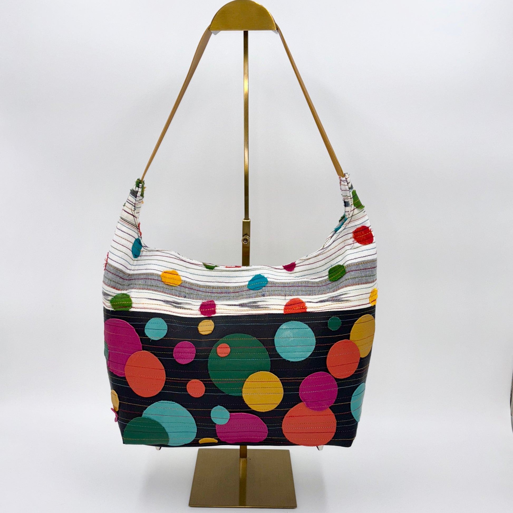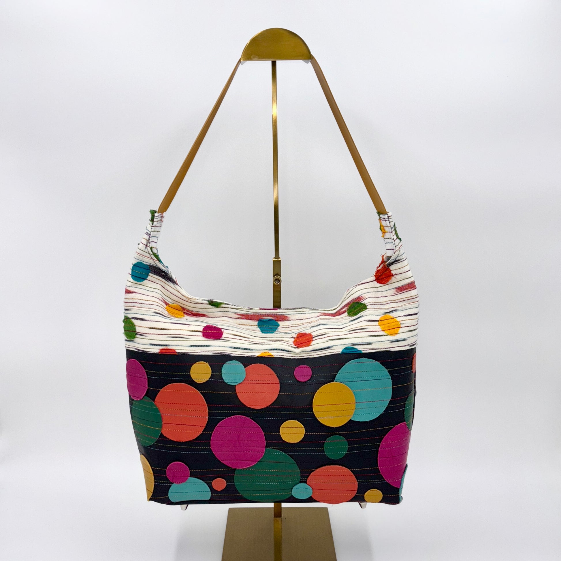 Made from dead stock linen fabric, dupioni, and gorgeous top grain premium leathers, this fun, unique bag is sure to wow! It has a magnetic snap closure, 3 inner slip pockets, and a yellow leather shoulder straps.