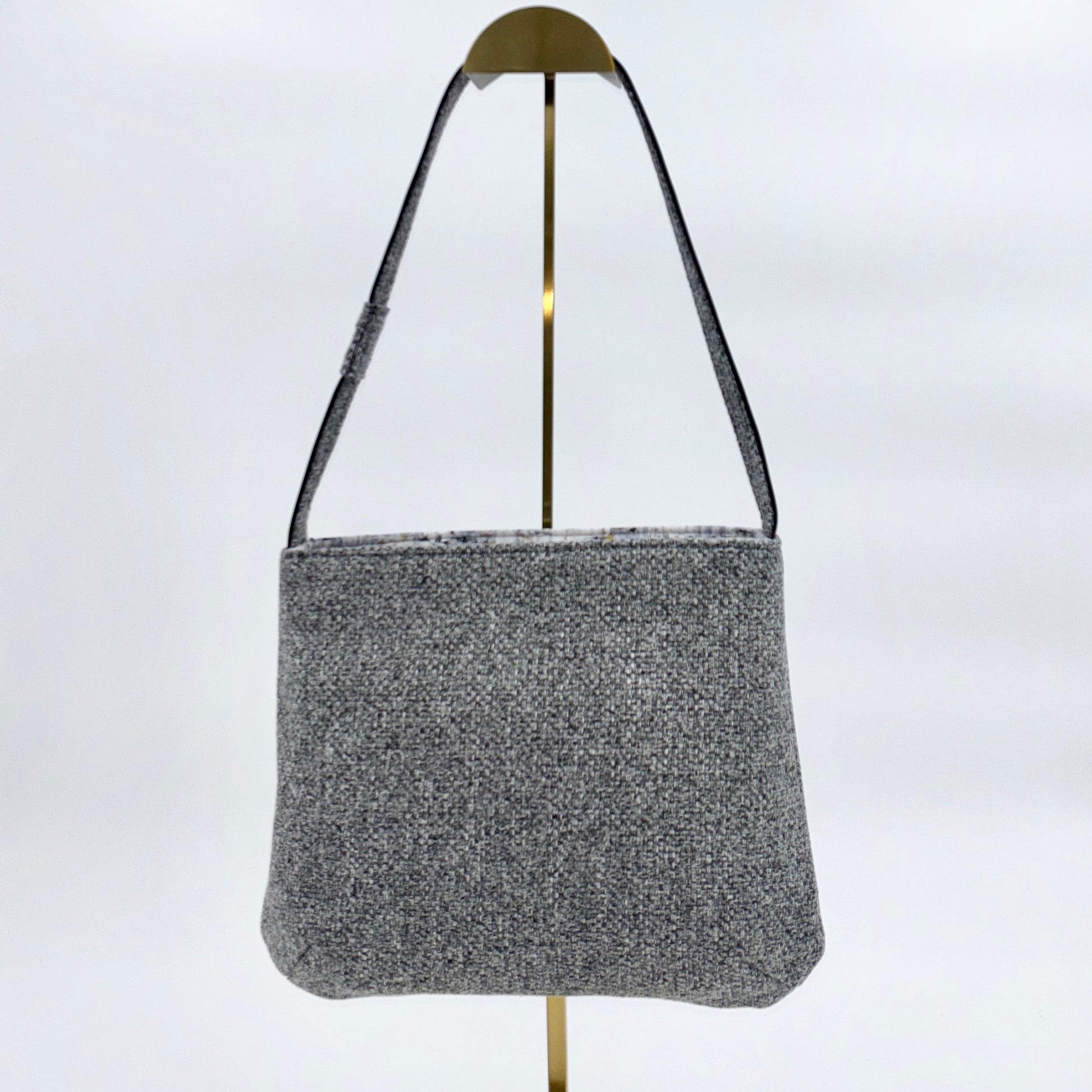 Made for our customizer, but beautiful as is! Stylish, elegant, timeless. Made from durable gray tweed and cotton with a vegan leather strap. It has 2 inner pockets (1 zippered, 1 slip).